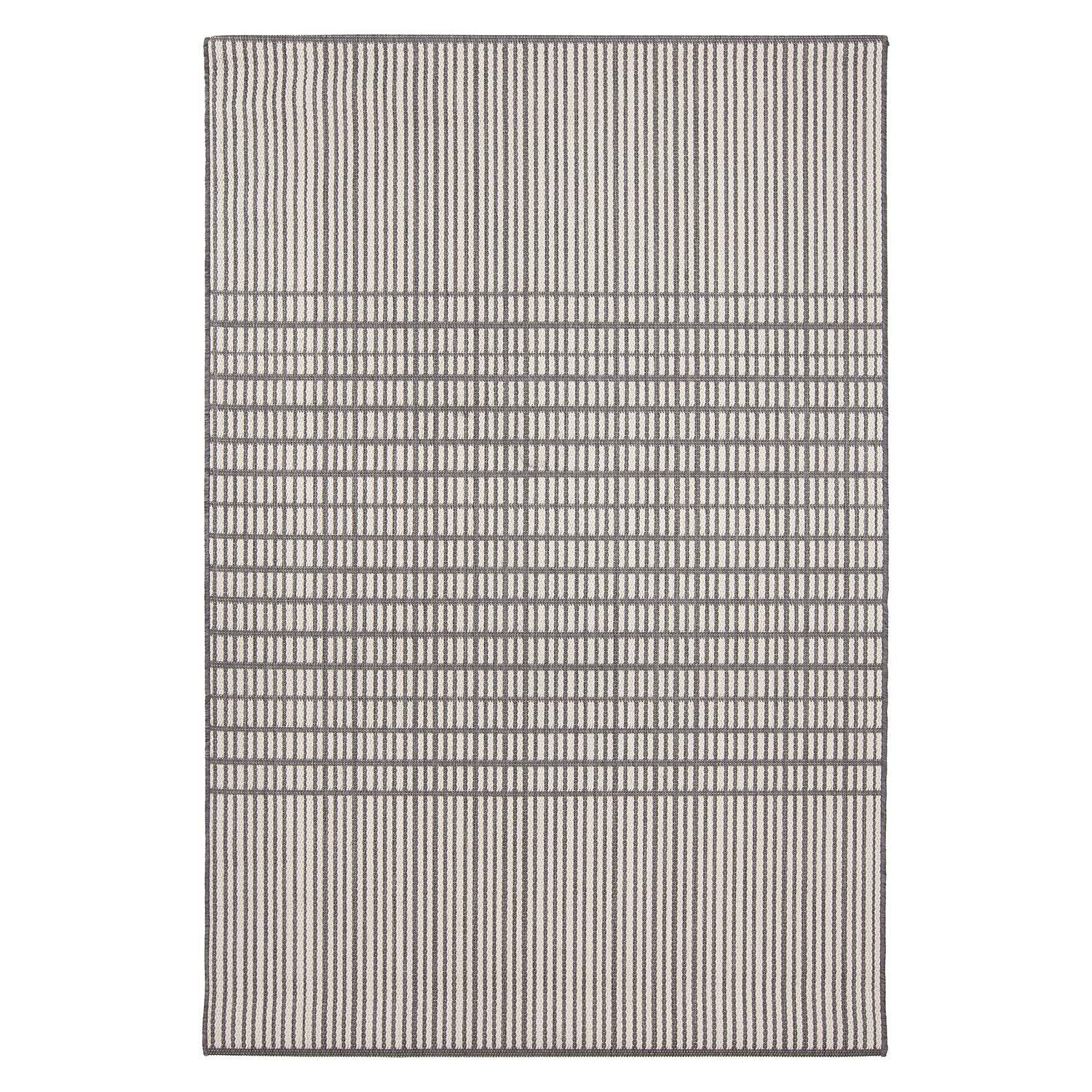 • Sileäpintainen musta-harmaa Verdi Lia matto sisä- ja ulkokäyttöön. Skandinaavinen raidoitus.