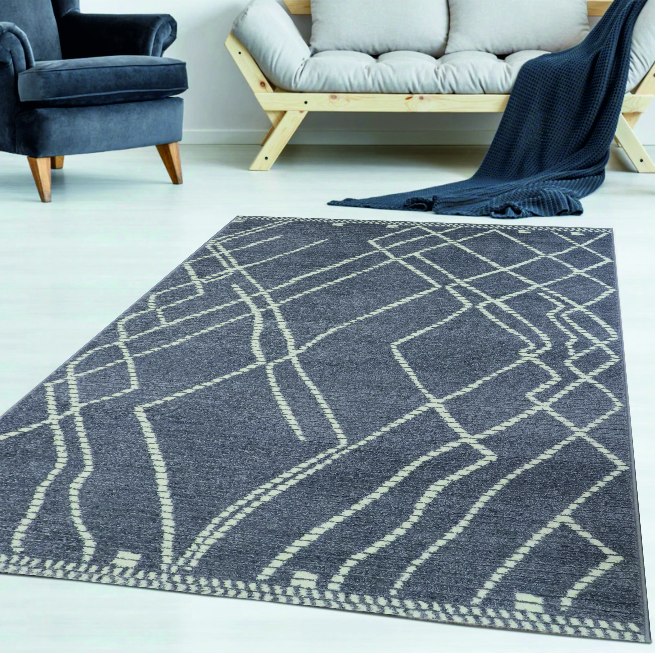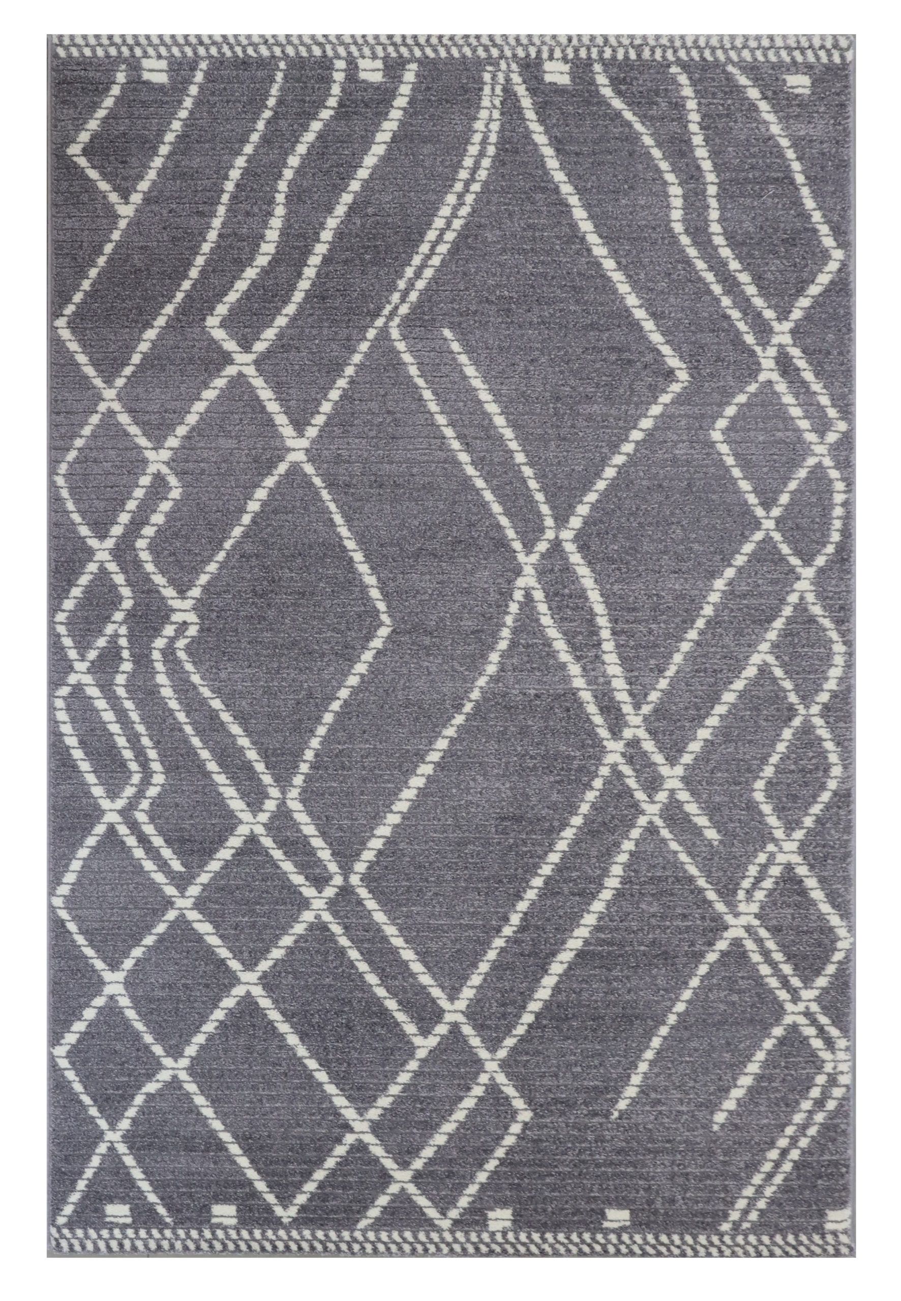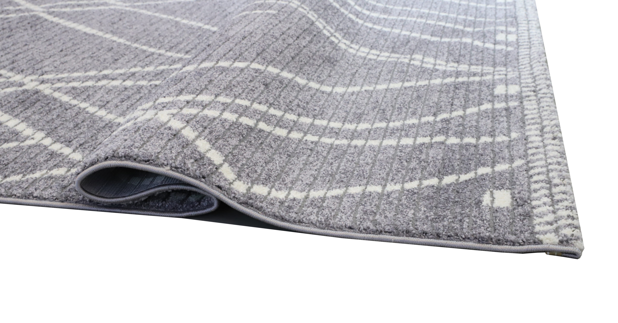 • Matalanukkainen, harmaa, epäsymmetrisesti vaalealla kuvioitu Vivia Noa-matto.